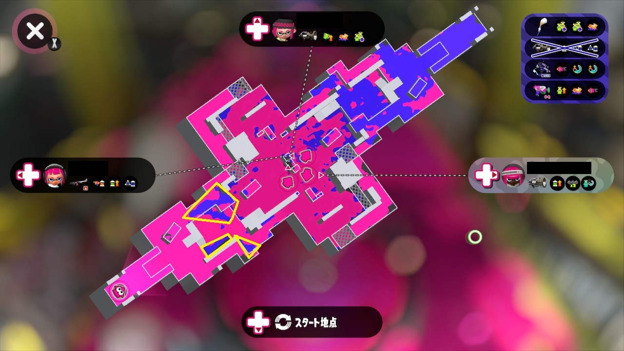 こう言った場所にスプリンクラーやボムを投げ込んだり、アメフラシ等を使うと、塗り返されずに試合終了…となることも少なくありません。