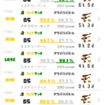 上の画像は前回のフェスデータ(きのこの山vsたけのこの里)で、下の画像(クリックで拡大)が全63戦の戦績データです。