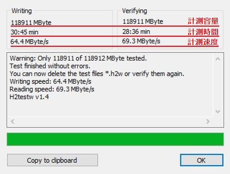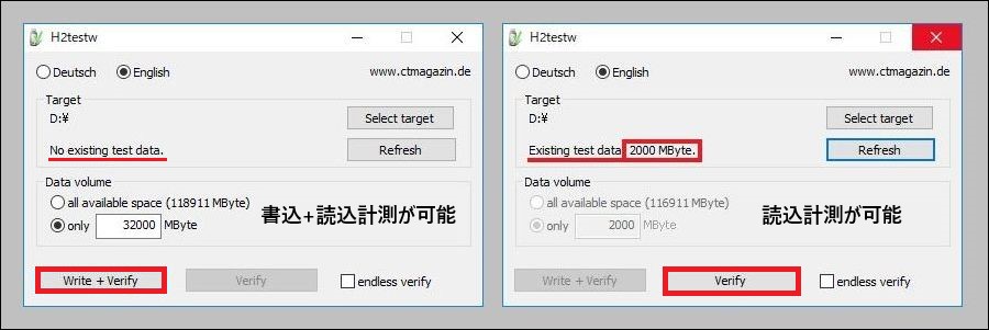 You can now delete the test files *.h2w or verify them again.(書き込んだデータを削除しなければVerifyの再計測が可能)