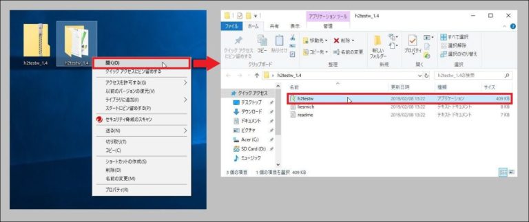 先ほど解凍した「新たに生成されたファイル」の方を開き、フォルダー内にある「H2testw」と言うアプリケーションを起動して下さい。