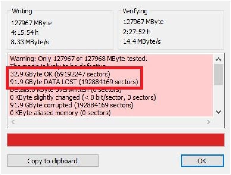 実際に128GB分のデータを書き込んでみると、32.9GB分のデータしか保存されておらず、残りの91.9GB分ものデータは消失…と言うことが上記の内容から分かります。